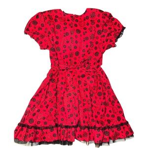 Step into a world of whimsical charm with this captivating red dress. The playful print of gears and clocks adds a fun steampunk flair, while the lace trim along the neckline and cuffs lends a touch of gothic elegance. The flattering fit/flare silhouette, accentuated by a ruffled hem and an underskirt of sheer black fabric, creates a delightful movement that will turn heads. Perfect for themed parties, a unique date night, or embracing your inner creative spirit.