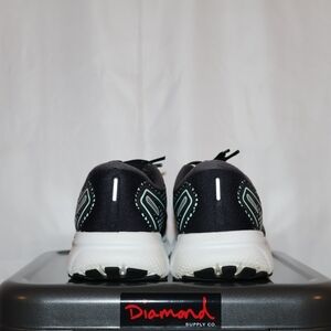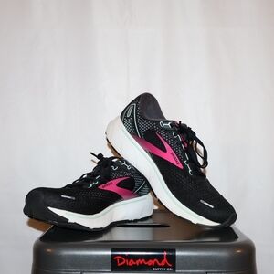 Brooks Ghost 14 running shoes in Black / Pink / Aqua colorway. Generally fit true to size. However, manufacturer recommend a half-size to one size larger.