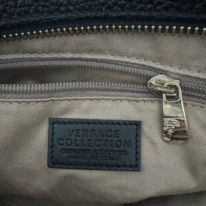 Versace Collection, soft black pebbled leather, gold hardware, zipper closure