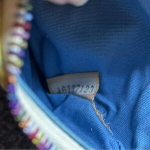 Dooney & Bourke Itsy Bitsy Ivory Multi-Color Monogram MIni Handbag. In overall good clean condition, there is noticeable leather aging/discoloration on one side of the bag versus the other. The interior is in good condition no stains or damage. Leather handle is in great condition. Besides the discoloration the bag is in good shape. Approximately 6”x6”x2”