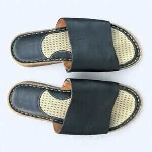 Women's Born Play Basic black leather comfort slides in a size 6 or eur 36.5. These shoes are the perfect, comfortable and casual summer sandal. They're in excellent preowned condition. Slight wear visible on the mesh of the footbed.