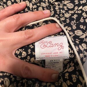 Beautiful vintage Petite Lanz two-piece set featuring a matching long sleeve blouse and a maxi skirt. This set has a classic cottagecore/prairie aesthetic with an allover delicate floral print and contrasting striped border at the hem and cuffs.