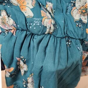 Keywords: Free People romper, floral print, teal romper, boho, festival, smocked waist, v neck, long sleeve, summer, vacation wear, casual, cute, feminine, flowy