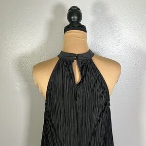 Elegant and on-trend, this pleated black mini dress features a luxe satin-look finish and flattering halter neckline. The flowy A-line silhouette offers movement and polish, perfect for upscale dinners, nights out, or glam events. Back keyhole with button closure. Good used condition.