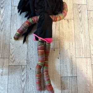 Handcrafted doll with multicolored yarn limbs and a black top. Unique and vibrant design.