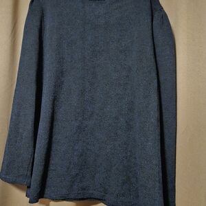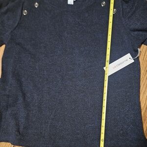 Elegant black crew neck sweater. Features button accents on shoulders. Soft and comfortable fabric.