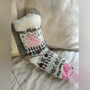 So cozy! Holiday Christmas themed socks with “Tis The Season” in script. They’re lined with soft plush fabric. I believe these would fit best on a woman’s size 7-9 shoe size. They have rubber grips on the bottom. 100% polyester.