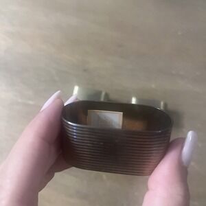 Set a four vintage brass/gold tone, ribbed, oval shaped napkin rings by the brand, Audrey. Please see images.