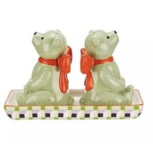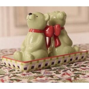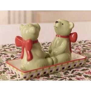 Cath Kidston Green Christmas Bears Salt & Pepper Shakers Set in Ceramic Tray NEW