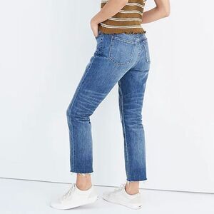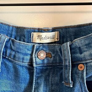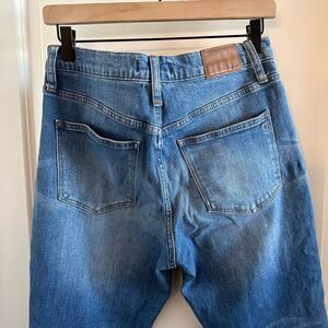 Madewell High Rise Slim Boyjean in Dover Wash size 26. Vintage inspired straight leg relaxed look with intentional distressing and raw hem. There is some really minor puckering near the zipper (see last photo) but not very noticeable when worn. Other than this in excellent condition.