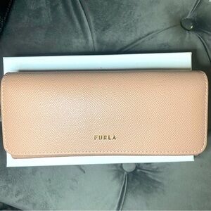 Elegant Furla wallet. Soft pink hue. Sleek design. Perfect for essentials.