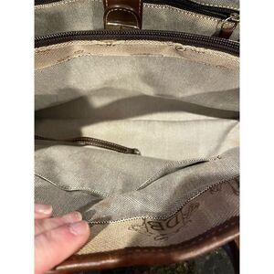 Keywords: Dooney & Bourke, satchel, top handle bag, canvas, leather, monogram, vintage, women's bag, brown bag, large satchel, pre-owned, everyday use, casual outings, sturdy base, protective feet.