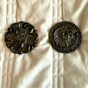 Unique, not sure what the metal is but on the heavier side, With women’s faces on both sides. James Lind on one and Wyoming Studio Art Works on both.