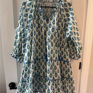 Flowing and fun! Gently worn, cotton, midi dress with three-quarter length sleeves. Comfortable and flattering!