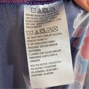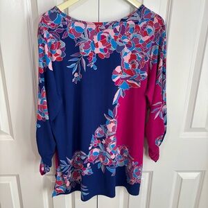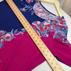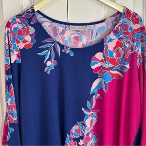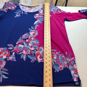 Susan Graver Vibrant Fucshia Blue Floral Print Liquid Knit Tunic Ruched Sleeve Blouse.