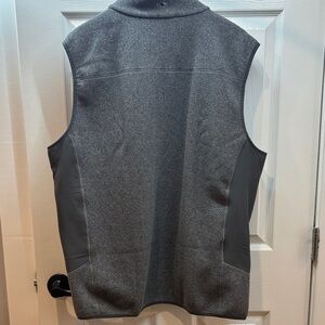 Soft gray fleece vest with black trim. Features a zip closure. Martha Vineyard