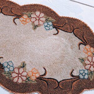 Vintage round hooked rug/dollie console pad, likely made in Occupied Japan during the 1940s. This oval piece measures approximately 15.75" x 8.75" with scalloped edges and a charming floral motif in taupe, brown, cream, blue, and orange tones.