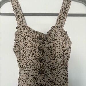 Chic beige midi dress with cheetah pattern. Features button-down front and sleeveless design. Perfect for versatile styling.