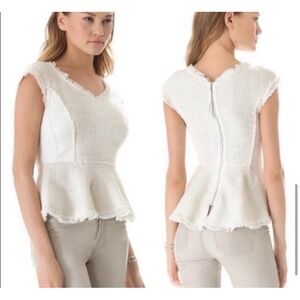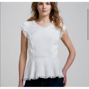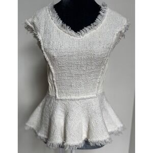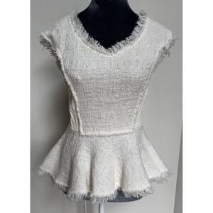 Fabulous ivory tweed and lamb leather top features a V neckline and capped sleeves. It has a peplum waist and is fully lined. It has a back zipper closure. The side panels are lamb leather and it has fringe detail edging.