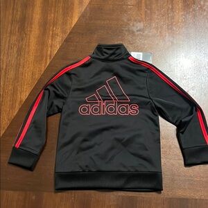 Stylish black jacket with red stripes. Features Adidas logo. Perfect for active kids.