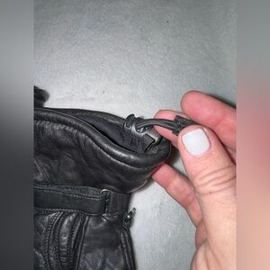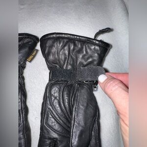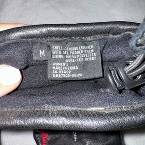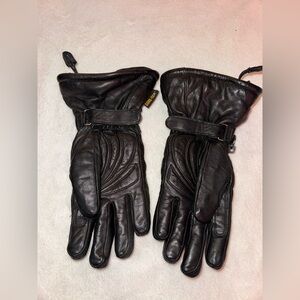 Black leather gloves with red and silver embroidery. Ideal for a stylish ride. Velcro and elastic pull wrist tightening straps. They’re in amazing condition and only worn twice..