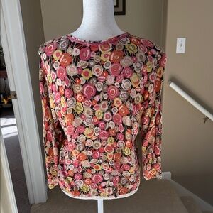 Charming floral jacket with vibrant patterns. Features a mix of pink, orange, and cream hues. Perfect for adding flair to any outfit.
