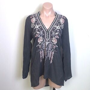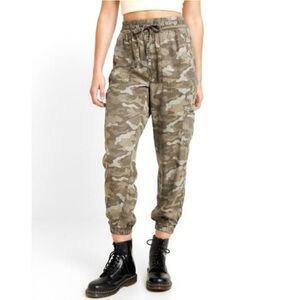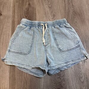 Rubbed looking wear all around the waist band. I think it’s made to look this way. Has drawstring and pockets. Super soft!