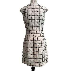 Introducing a preowned women's size 6 shift dress by Badgley Mischka, now available in excellent condition. This beautifully designed dress features a sophisticated predominantly white fabric adorned with a chic black check pattern, reminiscent of classic Chanel. Its unique tweed-like texture adds a touch of luxury, making it a standout piece for both work and social gatherings.