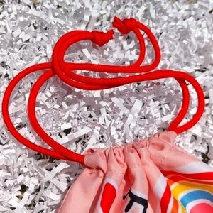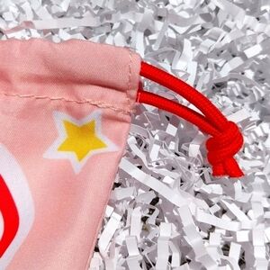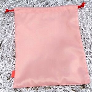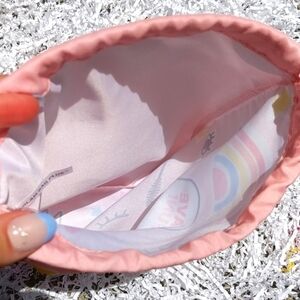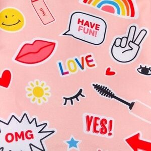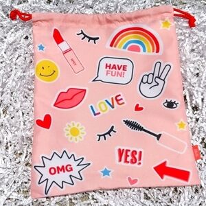 This small cosmetic bag is from June 2021. It is pink in color with a fun sticker print / design on the front side. It has a red drawstring that closes the bag. There is a dark pink tag on the corner of the bag that says IPSY. The inside of the bag is white. Super cute and convenient when traveling or separating products. Super cute print!