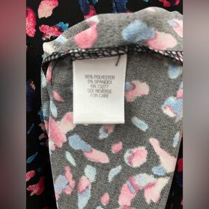 Beautiful Dana Buchman sleeveless blouse in a black base with colorful abstract floral print in pink, blue, and coral tones. Flattering V-neckline with soft pleating for an easy drape and polished look. Lightweight and comfortable with stretch — perfect for work, office, business casual, or everyday wear.
