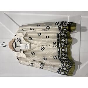 Elegant women's blouse from ZARA featuring a satin finish with a unique black and olive geometric print on a cream background. Button-up front with a classic collar and long sleeves. Size XL. Brand new with tags attached, however see photos for missing button and light makeup stain.