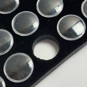 Elegant black foam form with holes for 50 small clear containers with lids that are included. New, never used. Perfect for storing small items such as beads, charms, etc. purchased from Amazon but never used
