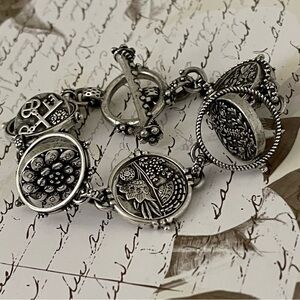 This boho old world Lucky Brand bracelet has disc-shaped coin links that swivel to create multiple combinations of different views.