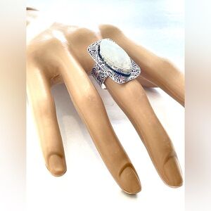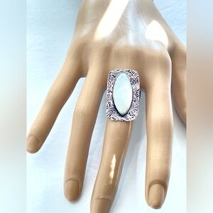 This elegant ring features a fabulous Moonstone Gemstone set in a beautifully detailed silver band. 925 Sterling Silver Overlay. This mystical gemstone measures approximately., 1”H x 3/8”L. Designed and made by Artisans. *Item is new but has no tag* Size 7.3/4 - Offers considered.