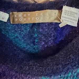 This item is a vintage Perry Ellis Portfolio color-blocked, crewneck mohair wool sweater. It features large checkered or block patterns in vibrant purple, blue, and green hues, giving it an 80s or 90s aesthetic. : As a vintage item, new pieces are rare; most are found pre-owned
