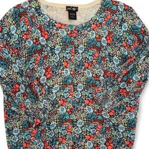 Super sweet cardi with a ditsy multicolored floral print grounded in navy. Extra button still attached.