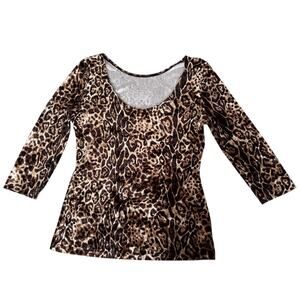 Boston Proper leopard print long sleeve top made in the USA. Features a flattering scoop neckline, soft stretch fabric, and a fitted silhouette. Brown and black animal print throughout. Comfortable, stretchy, and easy to dress up or down. Perfect statement top for layering or wearing on its own.