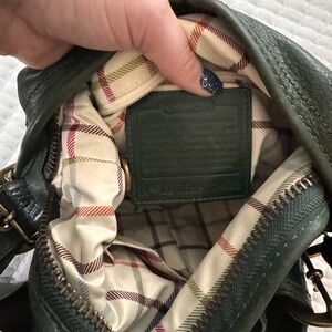 Sophisticated Coach shoulder bag in dark green leather. Features a sturdy strap and classic design.