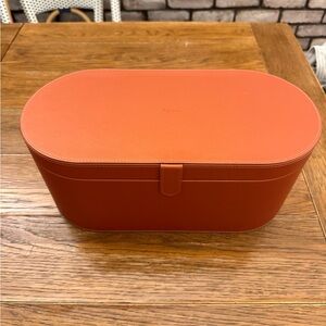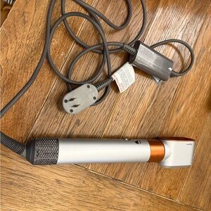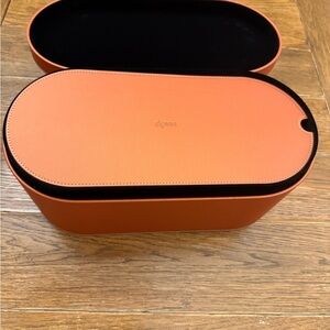 Elegant hair styling kit with versatile attachments. Features a sleek silver and orange finish.
