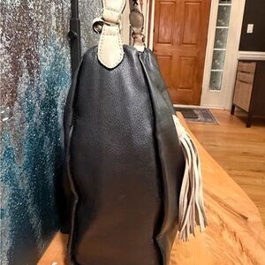 Featuring a sleek, slouchy silhouette, a zip-top closure for security, and unique dual-tone braided handle and tassel details, this bag is a versatile and elegant statement piece for any occasion.