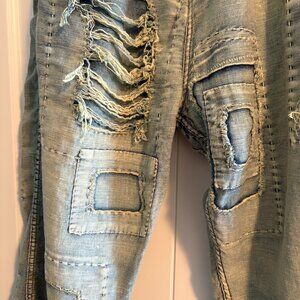 Stylish distressed denim pants. Unique patchwork design. Comfortable fit. New, never worn. Thanks for looking!