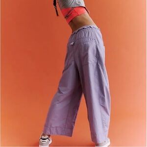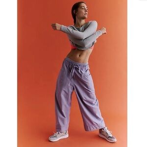 These pants by FP Movement from Free People feature a mid-rise fit, durable nylon fabrication, lightweight and breathable construction, wide-leg, barrel silhouette in a relaxed fit, double-waisted, drawstring adjustable waistband with ribbed detail, snap closure, large back and front pockets, and a locker loop at back.