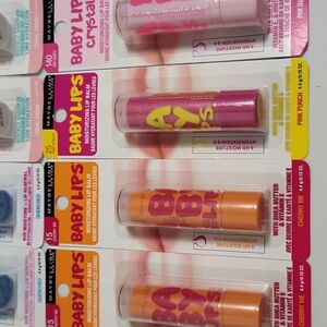 Vibrant collection of Maybelline Baby Lips lip balms. Includes shades in blue, white, orange, pink, and purple. Perfect for soft, hydrated lips.