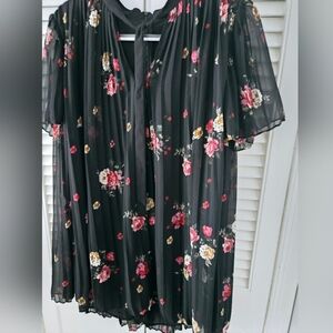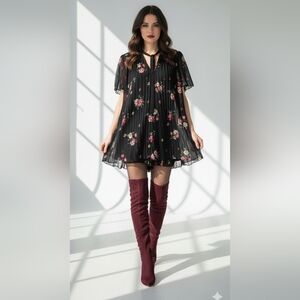Black floral pleated chiffon romper by Zara. Lightweight, airy, and easy with a swingy mini silhouette that looks like a dress but wears comfortably.