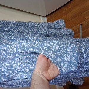 blue small floral patterned womens dress, light, flowy fabric, with comfy oversized fit, ruffle skirt, pockets, snap closure all the way down.