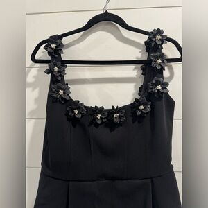 CINDY is a timeless classic crafted from black crepe fabric with large floral appliqués across the front and back of the square neckline. The flowers feature faux pearl and gold-look detailing at the centre. This style features corset boning to the front, back, and sides of the bodice, a structured pleat-detailed skirt, and a concealed zip closure. Finished fully lined in black satin for a smooth fit.