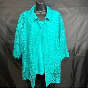 • Outer Layer: Lightweight, semi-sheer button-front shirt with a subtle textured pattern