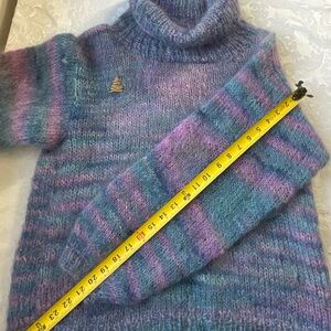 This hand-knit pullover sweater in women's size XL is made from luxurious Angora material in a deep blue and soft pink colors. The cowl neck adds a stylish touch while the knit pattern gives it a unique texture. Perfect for various occasions like travel, casual outings, workwear, or business meetings, this sweater exudes a classic fit with a hint of hipster, grunge, and bohemian styles. Hand wash only to maintain its quality, this sweater is ideal for the winter, fall, and spring seasons. The sweater had a small hole in the front which has been repaired using a technique called “visible mending”. This technique mends the hole while adding one of a kind detail to the sweater making it a piece that can be worn and cherished for years to come.