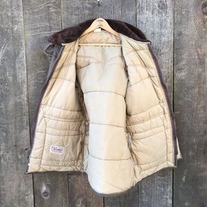 Vintage 1970s era Walls Blizzard-Pruf Insulated Apparel puffer jacket. Size LArge Regular on tag. Western style cut and details, with large wide faux fur collar. Made in USA. Has a number of small burn holes from campfire embers. See all pics. Overall good vintage condition.