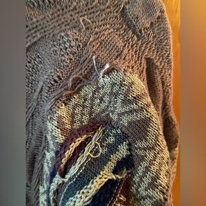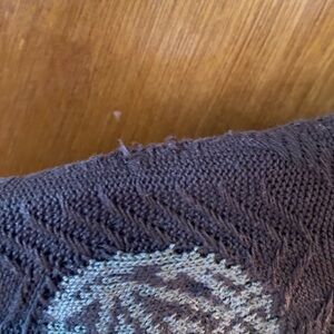 100% mercerized cotton. Signs of wear throughout. Many pulls which I dare not trim. Still a very solid, quality piece. Zipper runs perfectly. Priced according to condition. Sold as is.